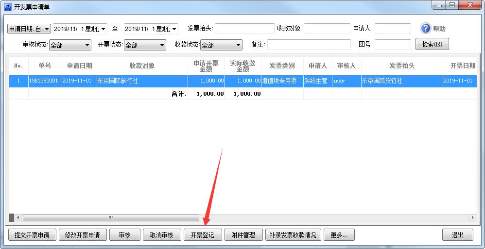 3、提交申請后,經過審核,點擊開票登記