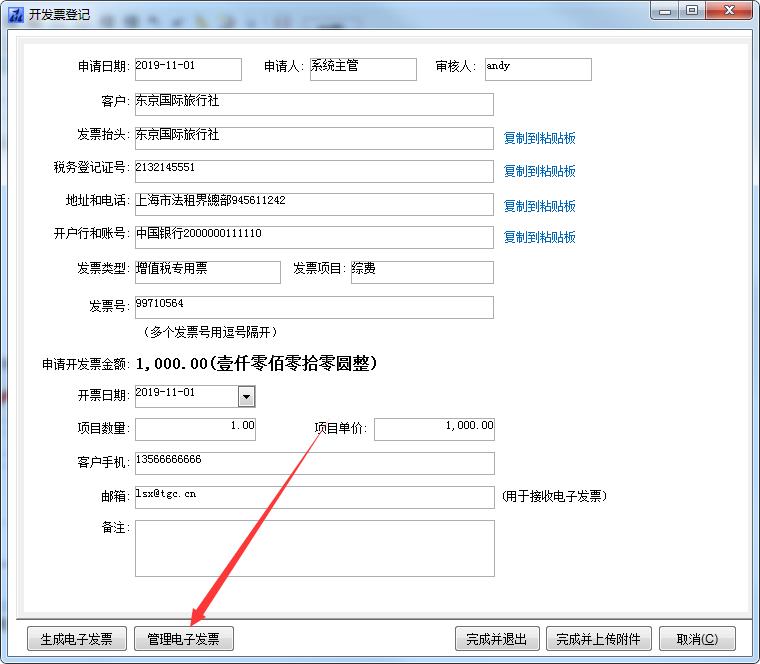 5、生成電子發票后,可以點擊【管理電子發票】查看和下載生成的電子發票PDF檔