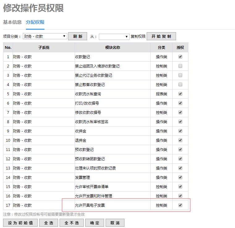 進入路徑:設置-組織架構-操作員管理-修改-分配權限-勾選“允許開具電子發票”