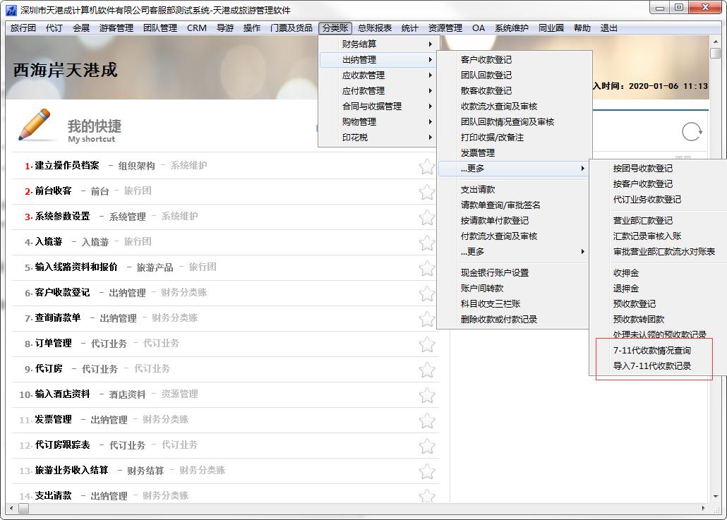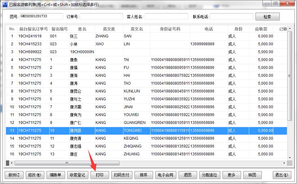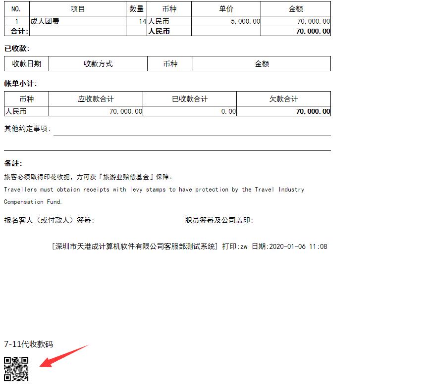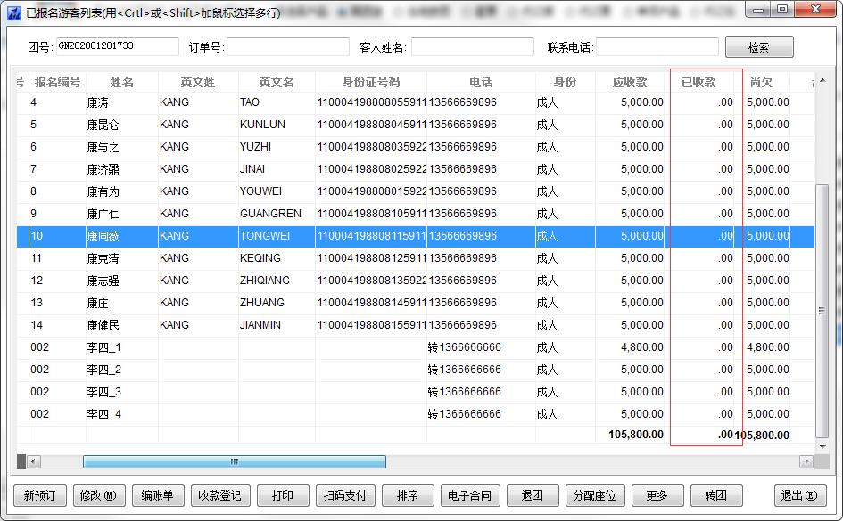 4.前臺已報名游客中會顯示該游客已收款的金額。