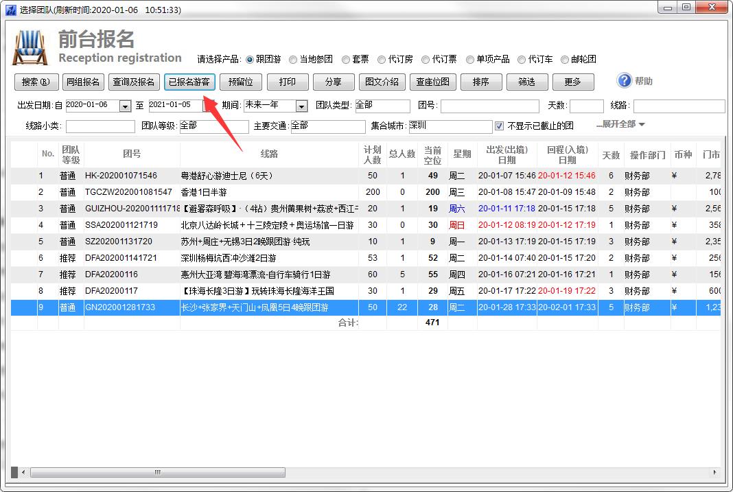 2.檢索出團(tuán)隊(duì),選中團(tuán)隊(duì),點(diǎn)擊【已報名游客】。