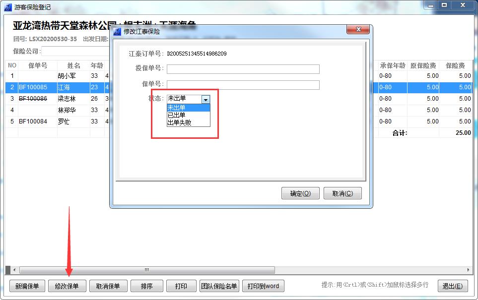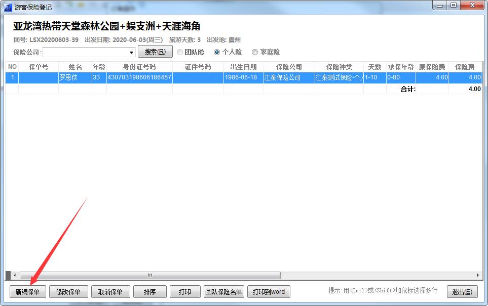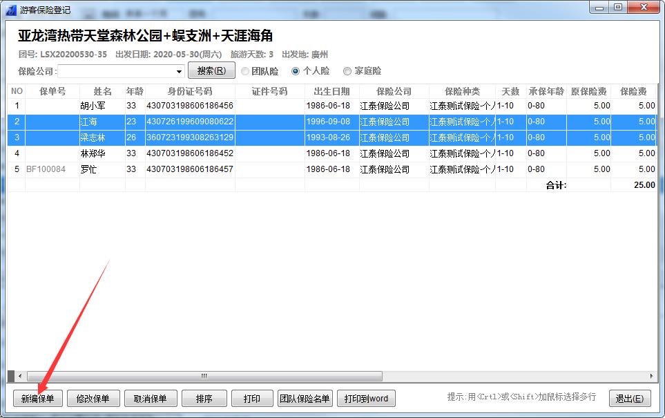 選擇要投保的游客,點擊新編保單,也可以選中多個游客一起投保