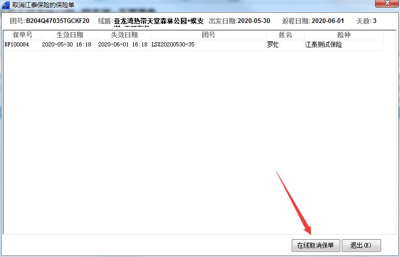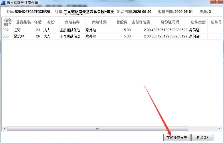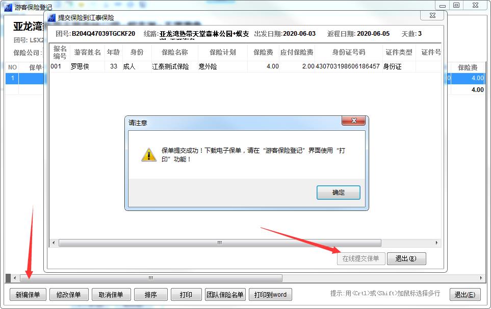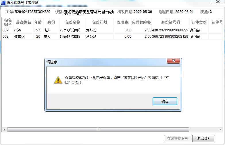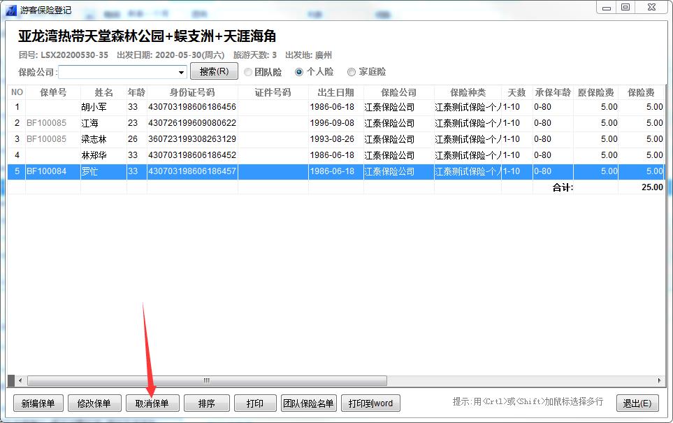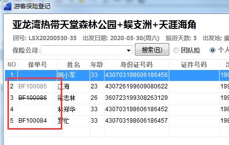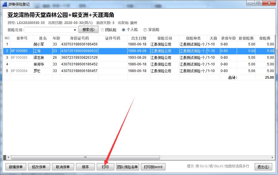 選中已出保單號的游客,點擊打印按鈕,如下圖:
