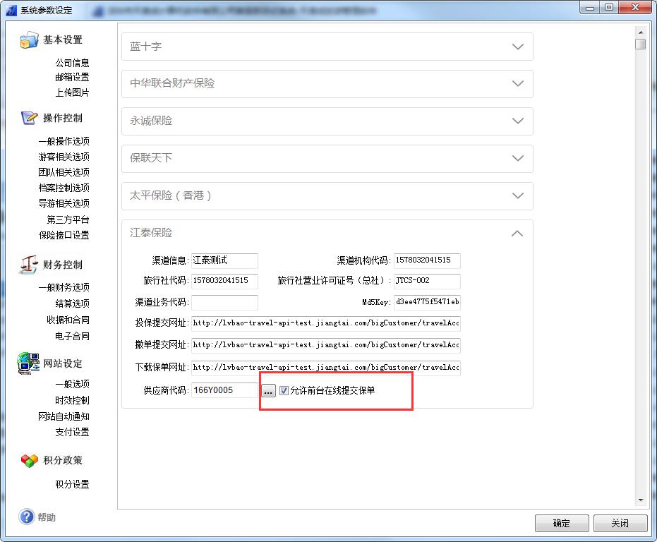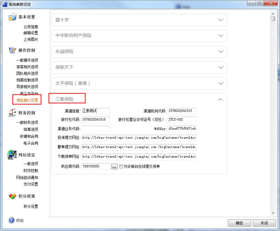 進入系統參數設置界面后,選擇保險接口設置模塊,然后點開江泰保險參數設置欄目,如下圖(注意:下圖所示參數,僅為測試參數,正式用戶的參數請向江泰相關人員直接獲取)