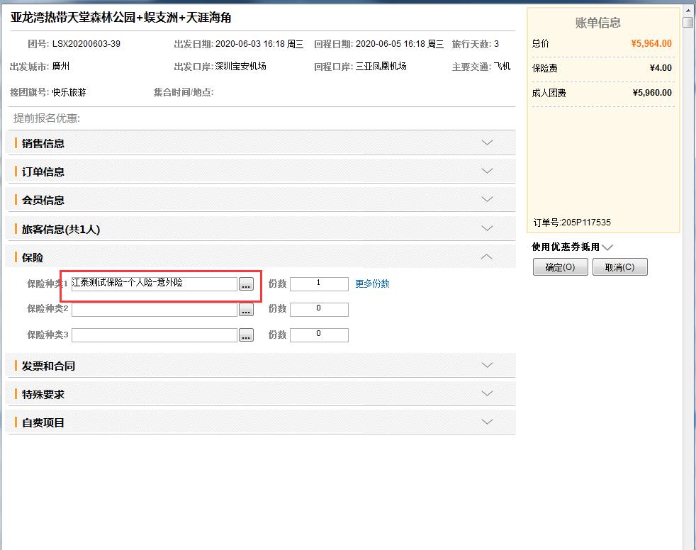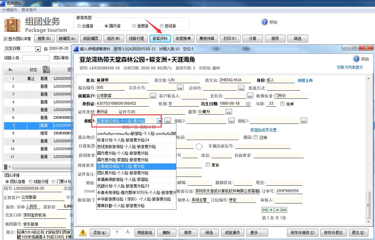 組團業務-游客資料進入,添加游客,選擇江泰的保險產品