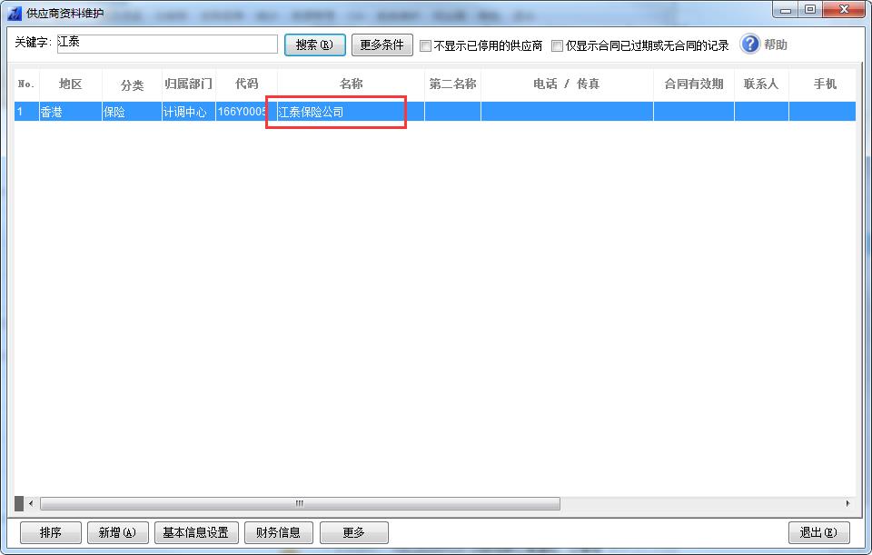 參數最后一項供應商代碼,選擇第一項里面設置好的供應商‘江泰保險公司’。