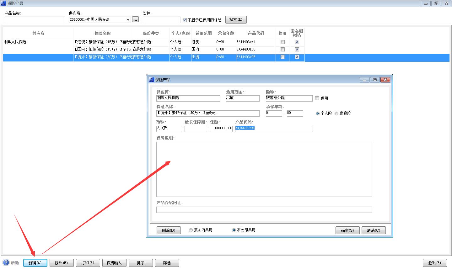 直接新增保險產品即可,注意:圖中產品代碼為測試產品,正式產品代碼請向人保公司那邊獲取