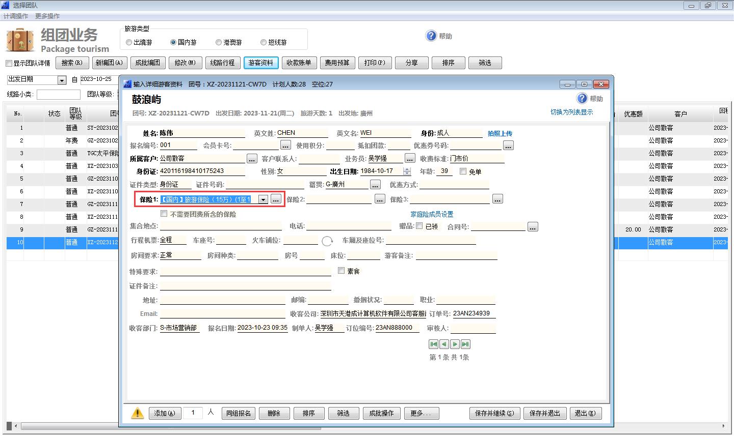 組團業務-游客資料進入,添加游客,選擇人保的保險產品
