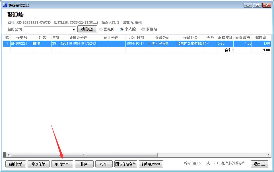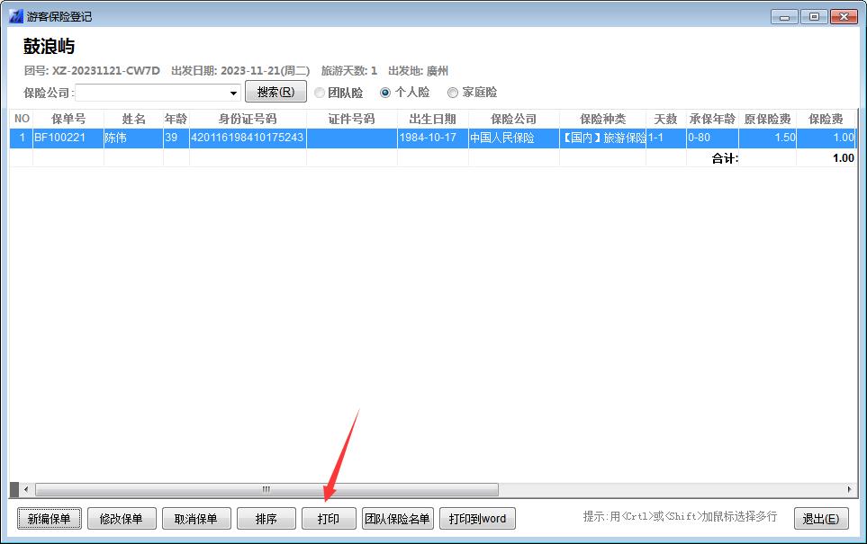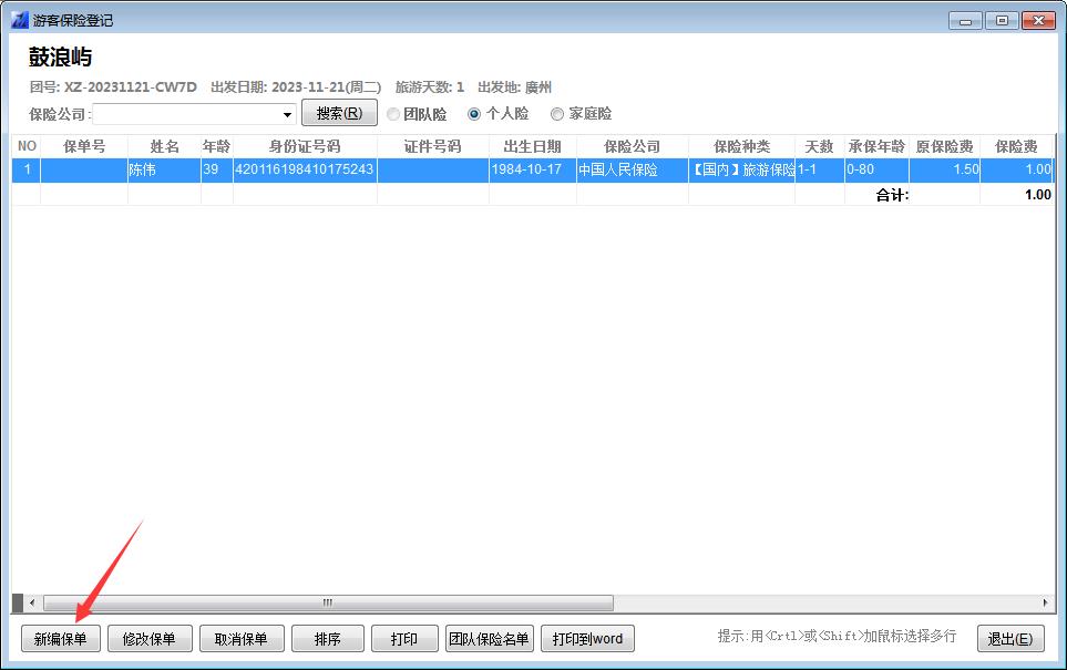 選擇要投保的游客,點擊【新編保單】,也可以選中多個游客一起投保