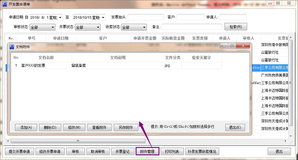 文檔附件是天港成軟件中一個重要模塊,它可以將客戶的往來單據、確認件、合同或發票等原始單據以電子檔的形式保存在數據庫中,以便隨時進行查詢和對賬。